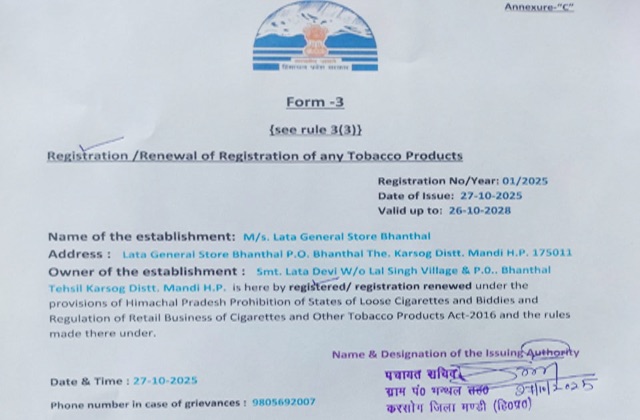 मंडी | हिमाचल Mandi: हिमाचल में शुरू हुई नई पहल! अब बिना लाइसेंस नहीं बिकेगा तंबाकू, करसोग में जारी हुआ प्रदेश का पहला तंबाकू विक्रेता लाइसेंस November 2, 2025