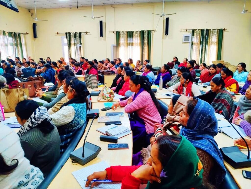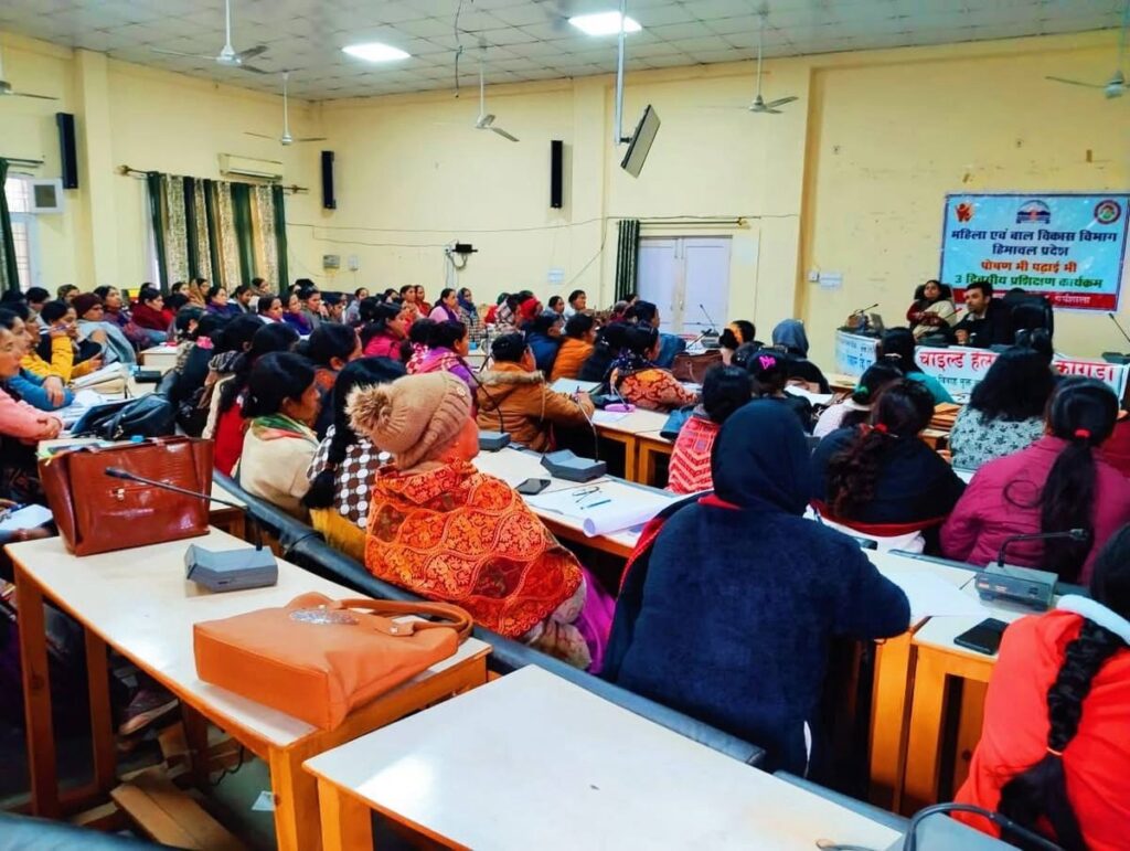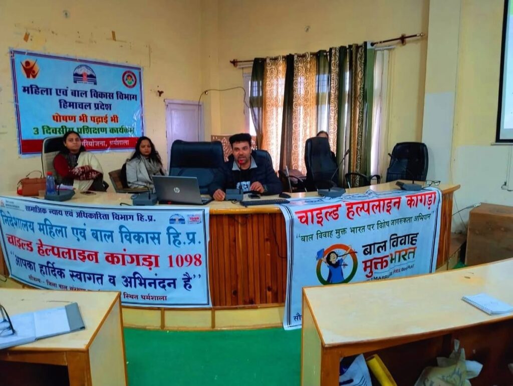 धर्मशाला, कांगड़ा। “बाल विवाह मुक्त भारत अभियान” के तहत आयोजित “पोषण भी पढ़ाई भी” प्रशिक्षण शिविर में आज बाल अधिकारों और बाल विवाह रोकथाम पर विशेष जागरूकता कार्यक्रम आयोजित किया गया। कार्यक्रम में चाइल्ड हेल्पलाइन कांगड़ा के जिला प्रभारी मनमोहन चौधरी ने रिसोर्स पर्सन के रूप में भाग लिया और आंगनवाड़ी कार्यकर्ताओं एवं पर्यवेक्षकों को बाल अधिकारों और चाइल्ड हेल्पलाइन की कार्यप्रणाली के बारे में जानकारी दी।