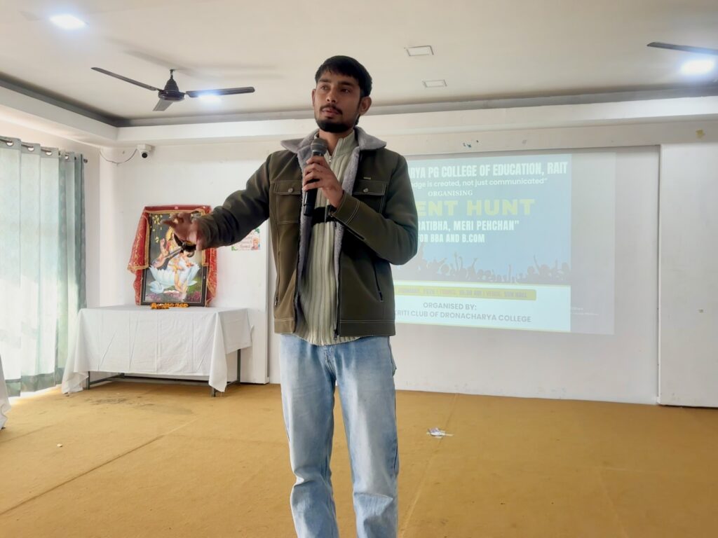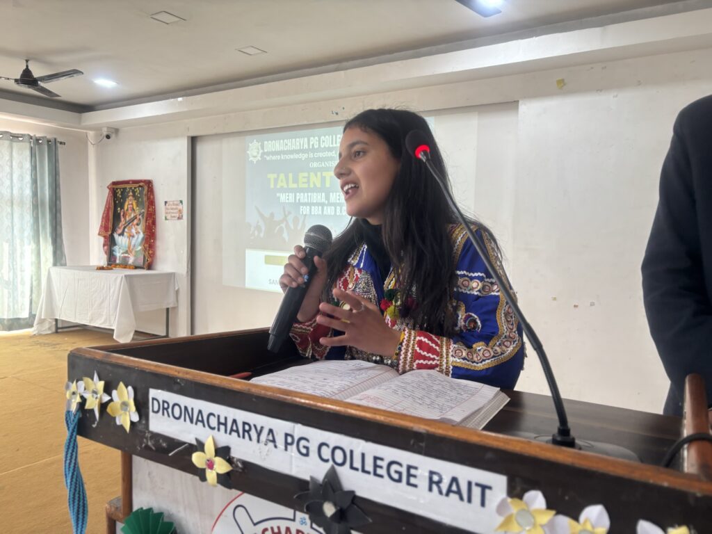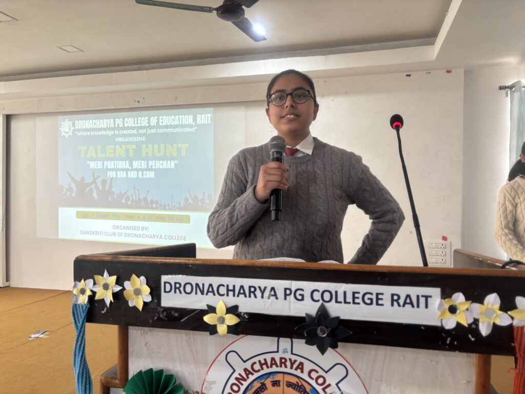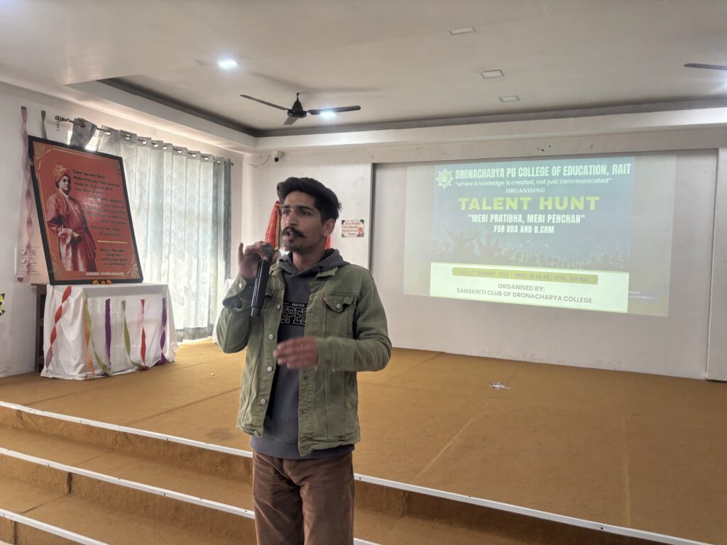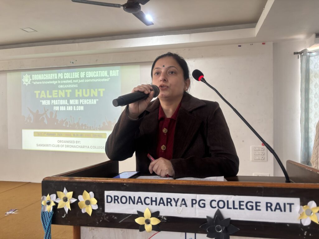 द्रोणाचार्य पोस्ट ग्रेजुएट कॉलेज ऑफ एजुकेशन, रैत में प्रथम वर्ष के BBA और B.Com छात्रों के लिए “मेरी प्रतिभा मेरी पहचान” शीर्षक से एक शानदार टैलेंट हंट कार्यक्रम का आयोजन किया गया। इस कार्यक्रम में छात्रों ने अपनी छिपी हुई प्रतिभाओं का शानदार प्रदर्शन किया और पूरे परिसर में उत्साह का माहौल देखने को मिला। कार्यक्रम के दौरान छात्रों द्वारा प्रस्तुत की गई रंगारंग सांस्कृतिक प्रस्तुतियों ने सभी का ध्यान आकर्षित किया।