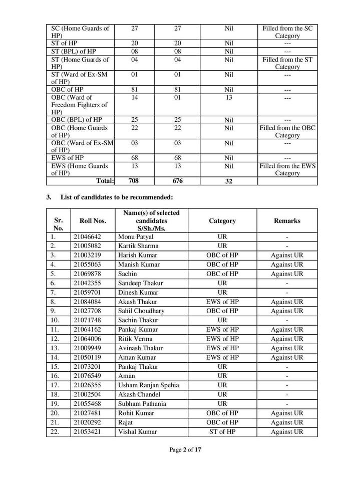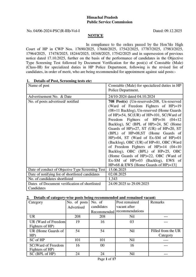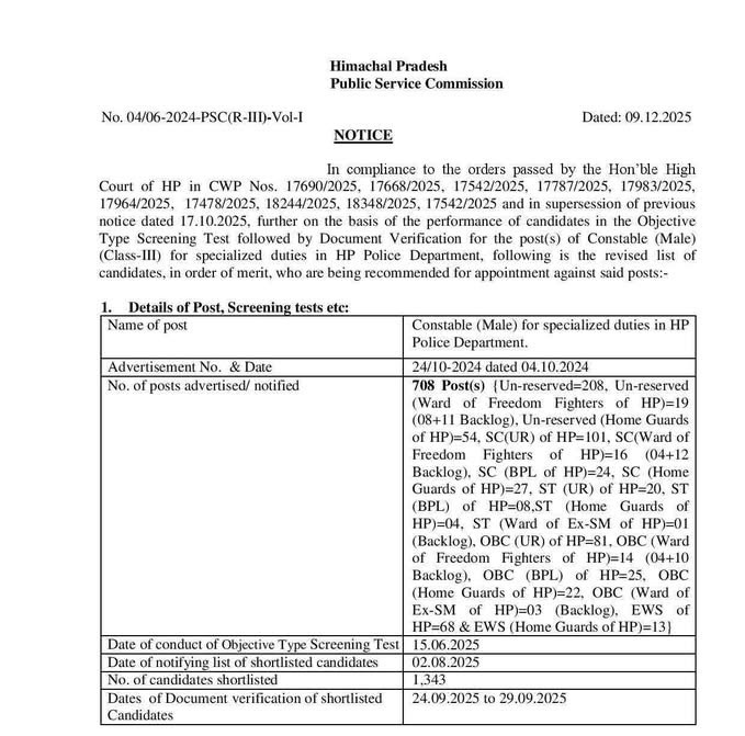 हिमाचल प्रदेश लोक सेवा आयोग ने पुलिस भर्ती मुख्य परीक्षा का परिणाम घोषित कर दिया है। परीक्षा में शामिल अभ्यर्थी आयोग की आधिकारिक वेबसाइट पर अपना परिणाम देख सकते हैं।