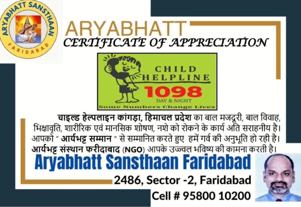 हिमाचल प्रदेश के काँगड़ा जिले की चाइल्ड हेल्पलाइन यूनिट को राष्ट्रीय संस्था “आर्यभट्ट संस्थान” की ओर से “आर्यभट्ट सम्मान” से नवाजा गया है। यह सम्मान पूरे प्रदेश में बाल संरक्षण के क्षेत्र में किए गए बेहतरीन कार्यों के लिए प्रदान किया गया है। जिला कार्यक्रम अधिकारी अशोक शर्मा ने बताया कि चाइल्ड हेल्पलाइन यूनिट काँगड़ा पूरे प्रदेश में बेहतरीन कार्य कर रही है और बच्चों के अधिकारों की रक्षा में अहम भूमिका निभा रही है। उन्होंने यह भी कहा कि जिलाधीश महोदय का निरंतर सहयोग इस उपलब्धि के पीछे एक महत्वपूर्ण कारण है और यह प्रशस्ति पत्र पूरे विभाग के लिए गर्व का विषय है।