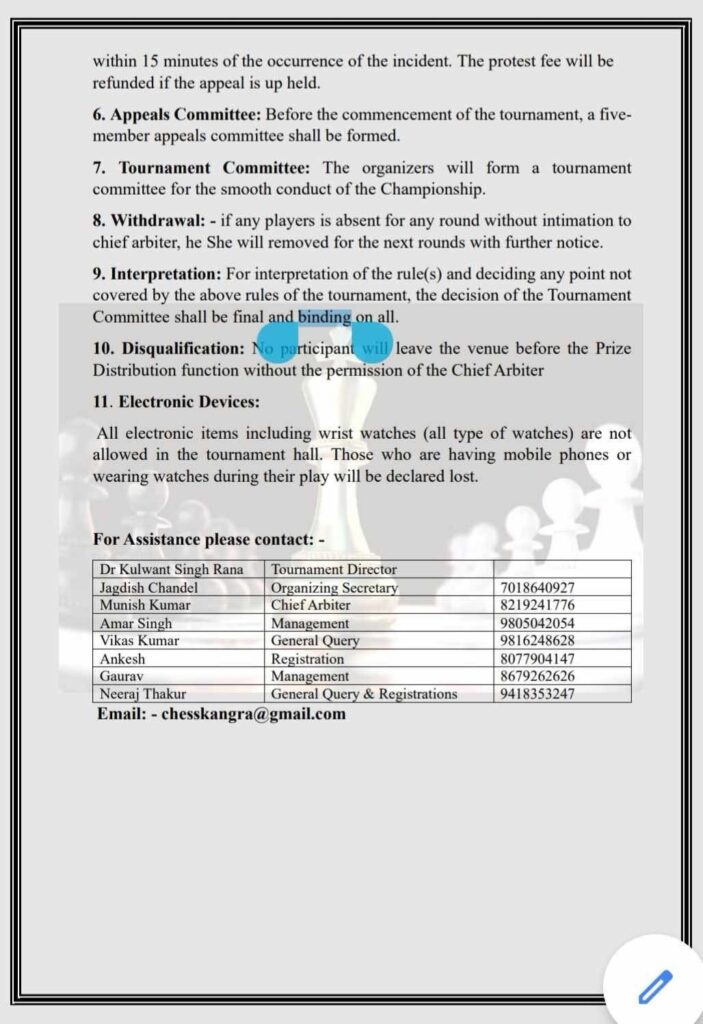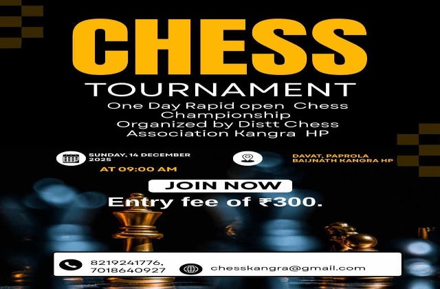 District Chess Association Kangra 14 दिसंबर 2025, रविवार को Davat Paprola में एक दिवसीय Rapid Chess Championship आयोजित करने जा रही है। यह प्रतियोगिता कांगड़ा सहित आसपास के क्षेत्रों के सभी आयु वर्ग के शतरंज खिलाड़ियों के लिए खुली है।