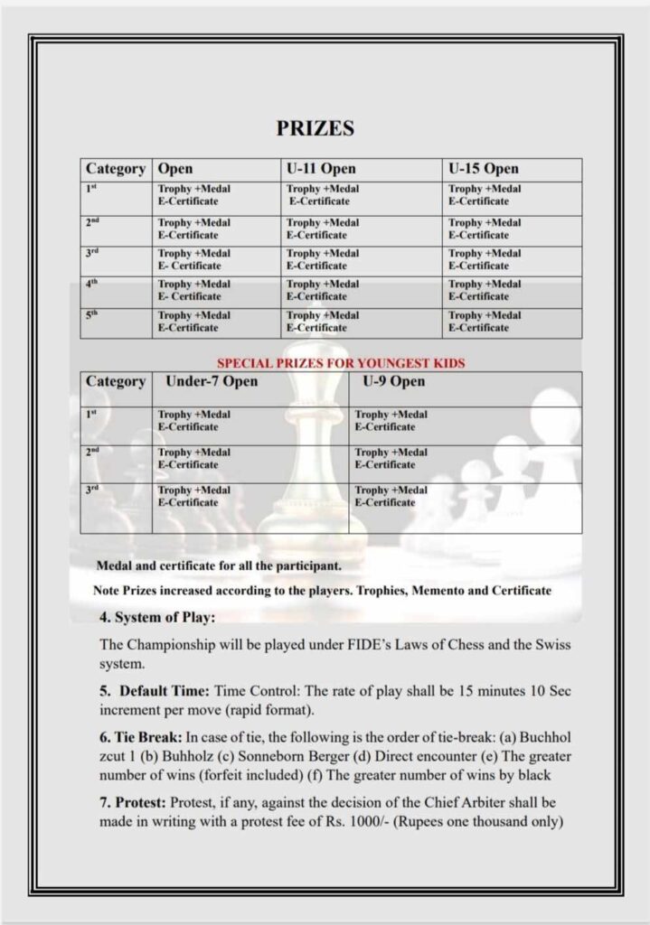 टूर्नामेंट स्विस सिस्टम के तहत 7 राउंड में खेला जाएगा। खास बात यह है कि यह नॉक-आउट आधारित मुकाबला नहीं होगा—प्रतियोगिता के दौरान सभी खिलाड़ी पूरे राउंड खेल पाएंगे और कोई भी प्रतिभागी मध्य में बाहर नहीं होगा। इससे खिलाड़ियों को अपनी क्षमता दिखाने और बेहतर प्रदर्शन करने का पूरा अवसर मिलेगा।