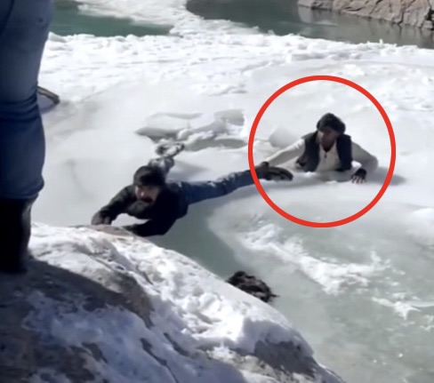 वीडियो बनाते समय अचानक उसके पैरों के नीचे जमी बर्फ चटक गई और युवक सीधे बर्फीले पानी में जा फंसा। यह मंजर देखकर वहां मौजूद लोगों की सांसें थम गईं। युवक कुछ पल के लिए पानी में फंसा रहा और हालात बेहद गंभीर हो गए।