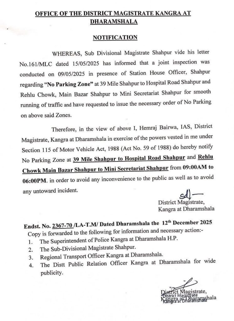 शाहपुर। कांगड़ा जिला प्रशासन ने शाहपुर क्षेत्र में बढ़ते ट्रैफिक दबाव को नियंत्रित करने के लिए बड़ा कदम उठाया है। जिला दंडाधिकारी हेमराज बैरवा ने मोटर वाहन अधिनियम, 1988 की धारा 115 के तहत अपनी शक्तियों का उपयोग करते हुए शाहपुर की दो प्रमुख सड़क मार्गों को नो पार्किंग जोन घोषित कर दिया है।