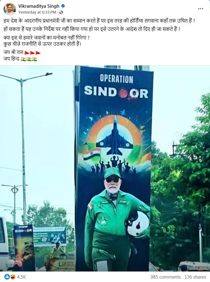 वहीं, लोक निर्माण मंत्री विक्रमादित्य सिंह ने भी इस मुद्दे पर अपनी प्रतिक्रिया सोशल मीडिया के माध्यम से दी है। उन्होंने कहा कि वह प्रधानमंत्री का सम्मान करते हैं, लेकिन इस तरह की होर्डिंग्स से जवानों का मनोबल गिर सकता है। उन्होंने यह भी कहा कि हो सकता है यह पोस्टर प्रधानमंत्री के निर्देश पर न लगाया गया हो, लेकिन फिर भी इसे हटाने के आदेश दिए जा सकते हैं। उनके इस बयान पर सोशल मीडिया पर हजारों लोगों ने प्रतिक्रिया दी है—कुछ ने इस कदम का समर्थन किया है, जबकि कुछ ने इसे राजनीति से प्रेरित बताया है।