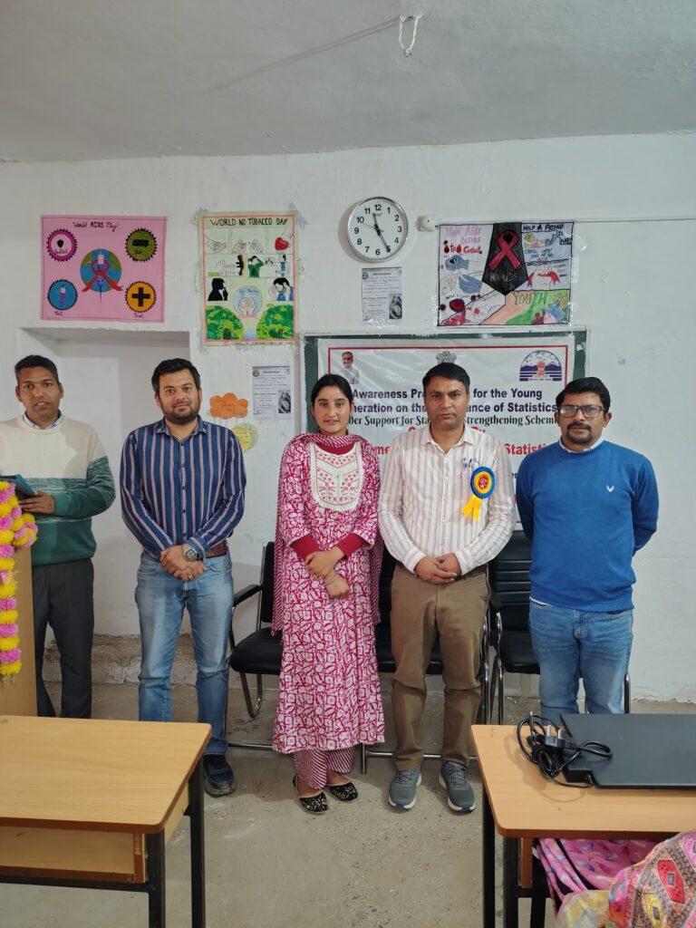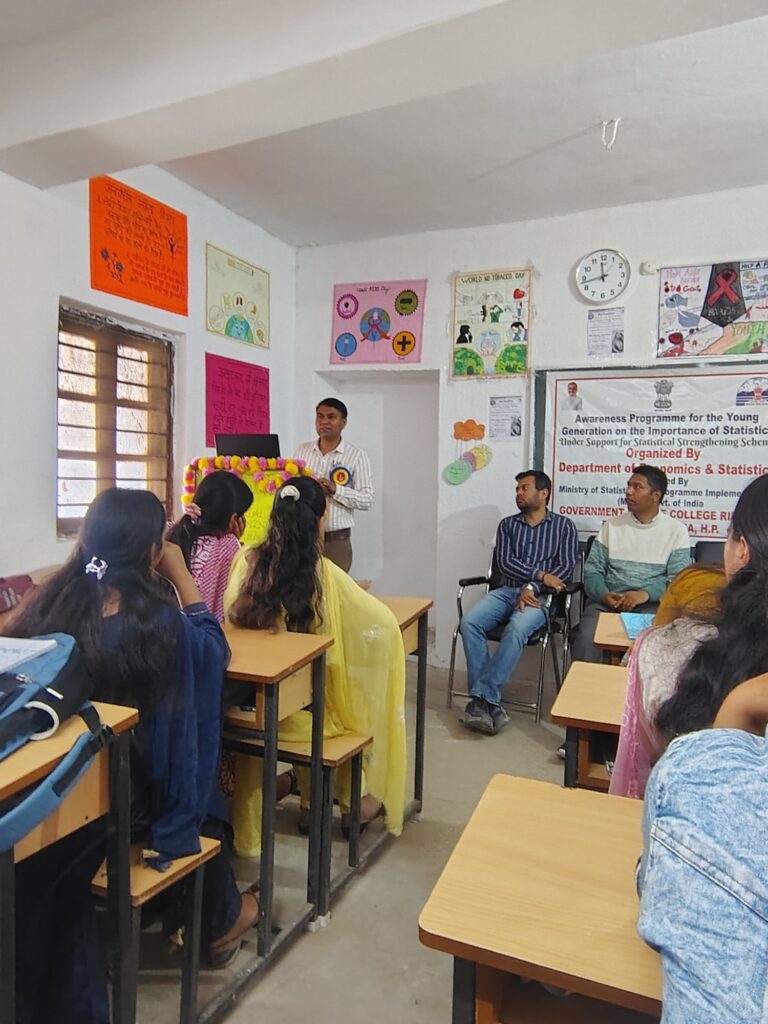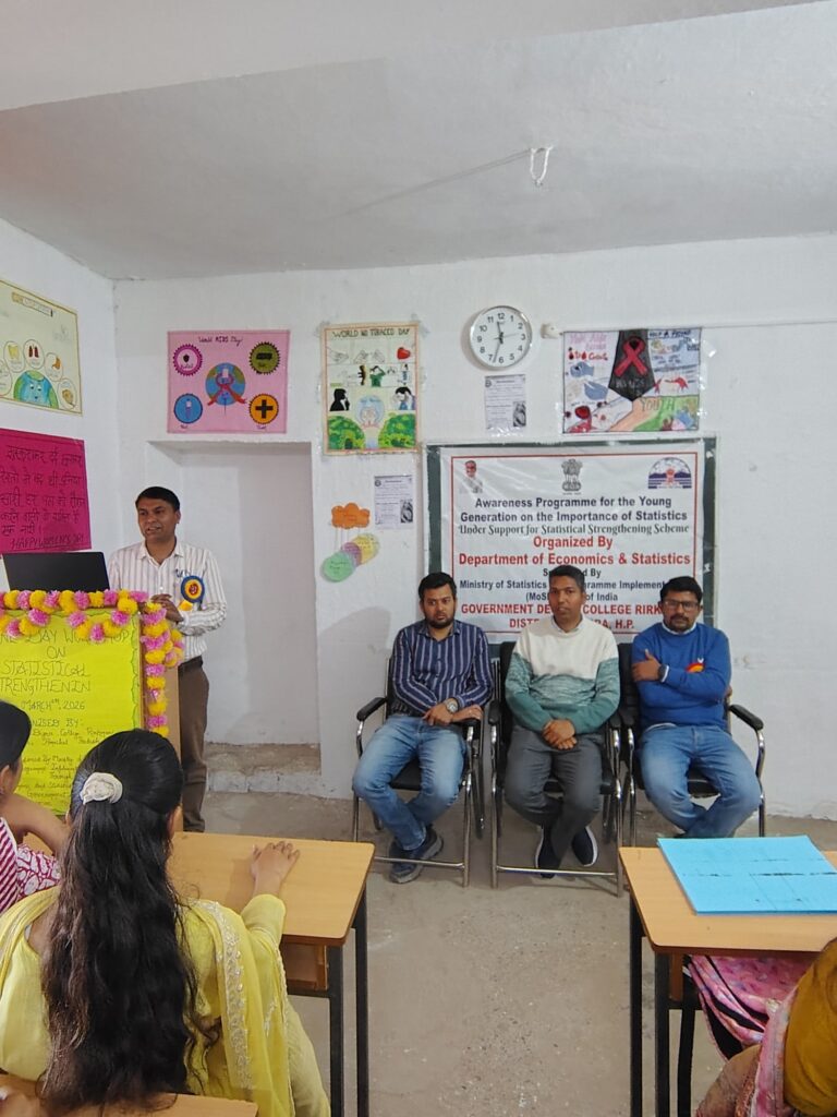 राजकीय महाविद्यालय रिड़कमार के अर्थशास्त्र विभाग में विद्यार्थियों के लिए एक ज्ञानवर्धक कार्यक्रम का आयोजन किया गया, जिसमें सांख्यिकीय उत्पादों के महत्व पर विस्तार से चर्चा की गई। यह विशेषज्ञ व्याख्यान 9 मार्च 2026 को हिमाचल प्रदेश सरकार के अर्थशास्त्र एवं सांख्यिकी विभाग के सहयोग से तथा भारत सरकार के सांख्यिकी एवं कार्यक्रम क्रियान्वयन मंत्रालय (MoSPI) के प्रायोजन के अंतर्गत Support for Statistical Strengthening (SSS) Scheme के तहत आयोजित किया गया। कार्यक्रम का मुख्य उद्देश्य युवा पीढ़ी को सांख्यिकीय उत्पादों के प्रति जागरूक करना था।