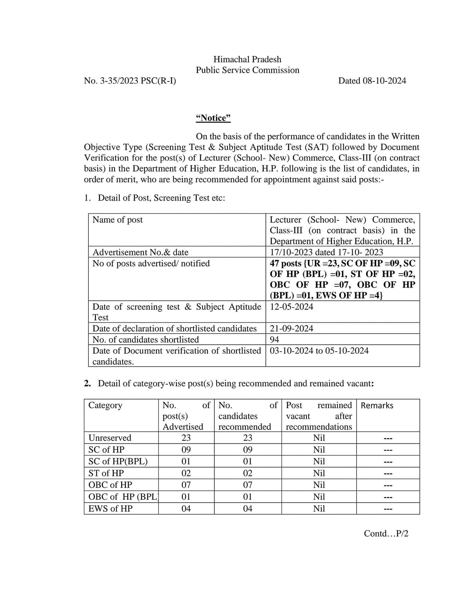 HPPSC शिमला ने 2024 के लिए लेक्चरर इन कॉमर्स के फाइनल...