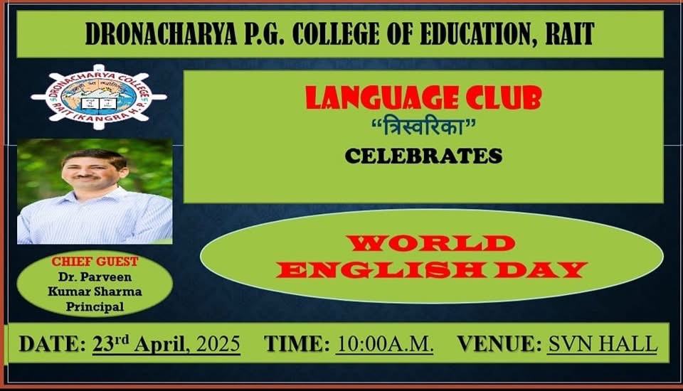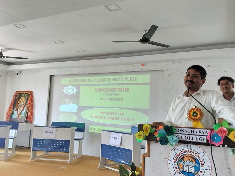 द्रोणाचार्य पी.जी. कॉलेज ऑफ एजुकेशन, रैत में विश्व अंग्रेज़ी भाषा दिवस को कॉलेज के भाषा क्लब के तहत बड़े उत्साह और सहभागिता के साथ मनाया गया। कार्यक्रम की शुरुआत दीप प्रज्वलन से हुई, जिससे वातावरण में आध्यात्मिक और सांस्कृतिक ऊर्जा का संचार हुआ। इस अवसर पर कॉलेज के प्राचार्य डॉ. परवीन कुमार शर्मा मुख्य अतिथि के रूप में उपस्थित रहे। कार्यक्रम में आयोजित विभिन्न प्रतियोगिताओं का मूल्यांकन सहायक प्रोफेसर अनीश कोरला द्वारा किया गया।